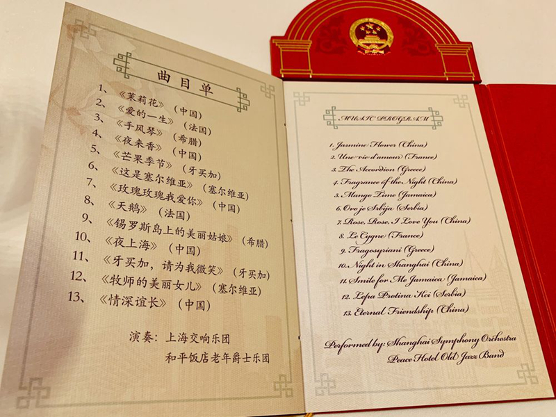 晚宴上,來自上海交響樂團(tuán)、和平飯店老年爵士樂團(tuán)的樂手們,演奏了中國(guó)、法國(guó)、希臘、牙買加、塞爾維亞的13首名曲,讓各國(guó)客人賓至如歸。