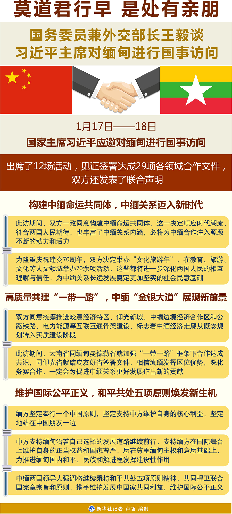 新華社內比都1月18日電? 1月17日至18日,國家主席習近平應邀對緬甸進行國事訪問。行程結束之際,國務委員兼外交部長王毅向隨行記者介紹此訪情況。