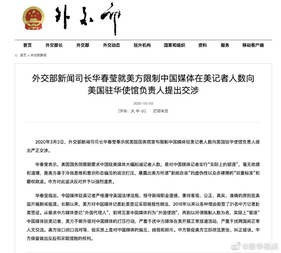 華春瑩就美方限制中國媒體在美記者人數向美國駐華使館負責人提出交涉-新華網
