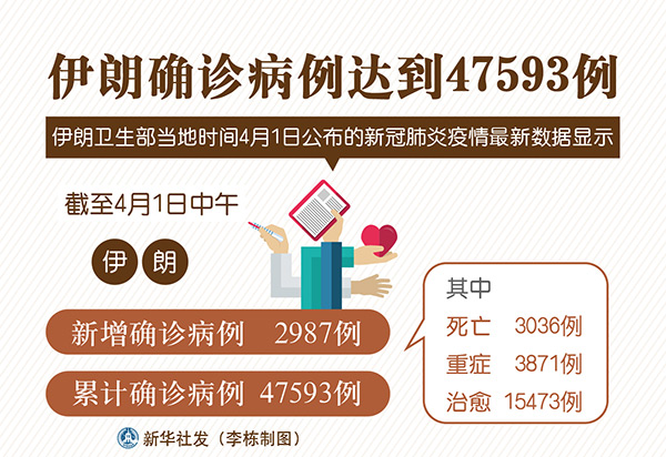 新華社德黑蘭4月1日電(記者陳霖)伊朗衛生部4月1日公布的新冠肺炎疫情最新數據顯示,截至當天中午,伊朗新增確診病例2987例,累計確診病例47593例,其中死亡3036例,重癥3871例,治愈15473例。