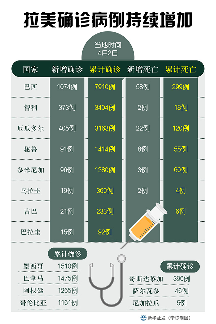 新華社圣保羅4月2日電 綜合新華社駐拉美地區記者報道:拉美各國衛生部門2日發布的新冠疫情最新數據顯示,拉美地區確診病例持續增加。多國采取了隔離、停課、宵禁等措施應對疫情。