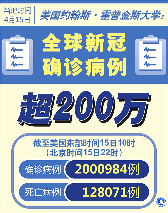 新華社紐約4月15日電 美國約翰斯·霍普金斯大學15日發布的新冠疫情最新統計數據顯示,截至美國東部時間15日10時(北京時間15日22時),全球新冠確診病例達2000984例,死亡病例為128071例。