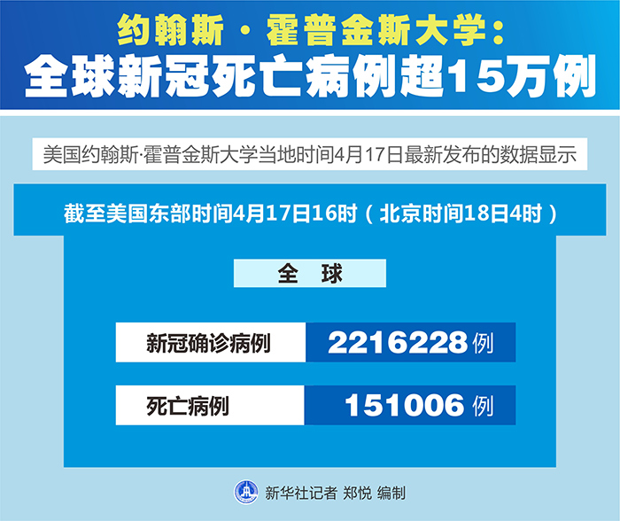 新華社紐約4月17日電 美國約翰斯·霍普金斯大學(xué)17日最新發(fā)布的數(shù)據(jù)顯示,截至美國東部時(shí)間17日16時(shí)(北京時(shí)間18日4時(shí)),全球新冠死亡病例超過15萬例,達(dá)到151006例,全球確診病例達(dá)2216228例。