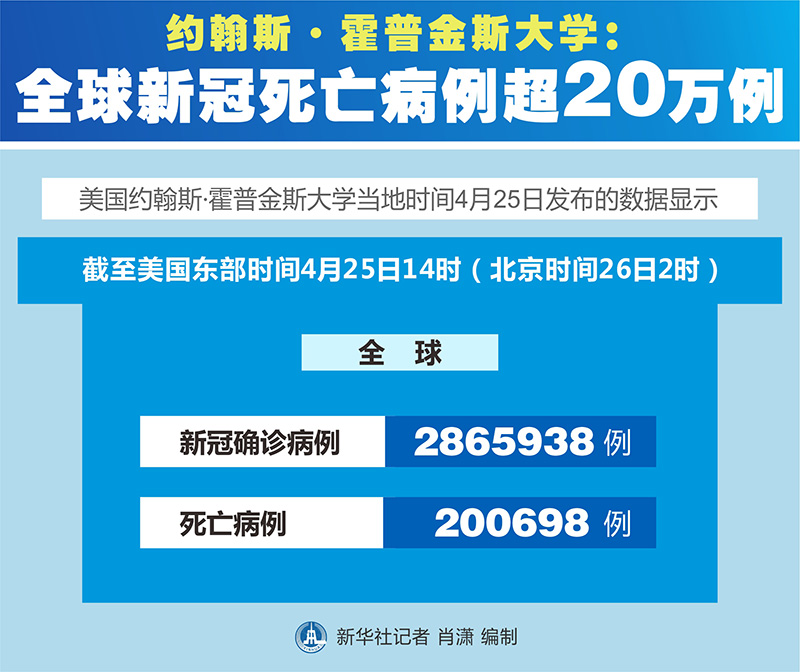 新華社紐約4月25日電? 美國約翰斯·霍普金斯大學(xué)25日發(fā)布的新冠疫情最新統(tǒng)計(jì)數(shù)據(jù)顯示,全球新冠死亡病例超過20萬例。