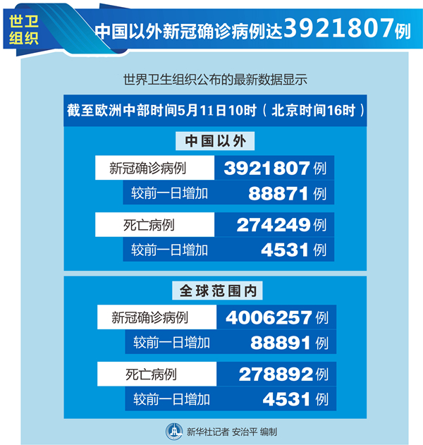 世衛組織每日疫情報告顯示,截至歐洲中部時間11日10時(北京時間16時),中國以外確診病例較前一日增加88871例,達到3921807例;中國以外死亡病例較前一日增加4531例,達到274249例。
