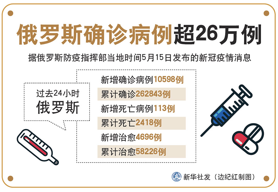 新華社莫斯科5月15日電(記者魯金博)據(jù)俄羅斯防疫指揮部15日發(fā)布的新冠疫情消息,過(guò)去24小時(shí)俄新增確診病例10598例,累計(jì)確診262843例;新增死亡病例113例,累計(jì)死亡2418例;新增治愈4696例,累計(jì)治愈58226例。