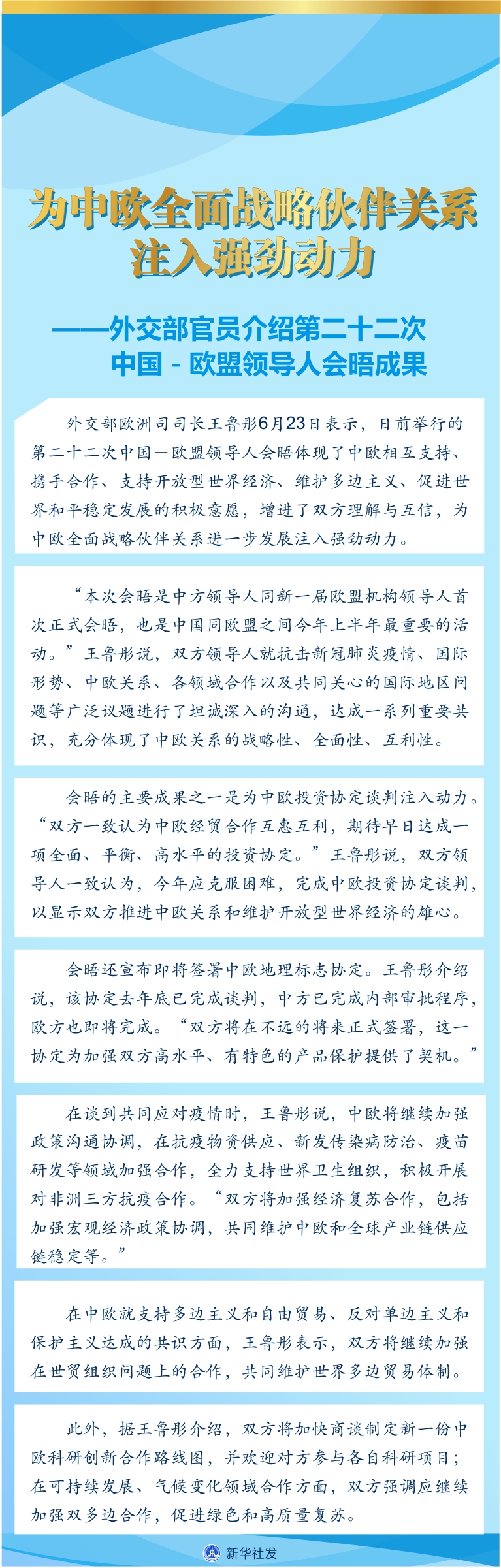 新華社北京6月23日電(記者王賓)外交部歐洲司司長王魯彤23日表示,日前舉行的第二十二次中國-歐盟領導人會晤體現了中歐相互支持、攜手合作、支持開放型世界經濟、維護多邊主義、促進世界和平穩定發展的積極意愿,增進了雙方理解與互信,為中歐全面戰略伙伴關系進一步發展注入強勁動力。