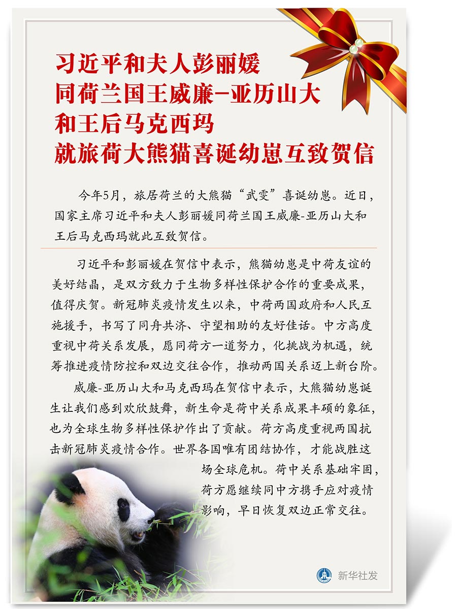 習近平和彭麗媛在賀信中表示,熊貓幼崽是中荷友誼的美好結晶,是雙方致力于生物多樣性保護合作的重要成果,值得慶賀。新冠肺炎疫情發生以來,中荷兩國政府和人民互施援手,書寫了同舟共濟、守望相助的友好佳話。中方高度重視中荷關系發展,愿同荷方一道努力,化挑戰為機遇,統籌推進疫情防控和雙邊交往合作,推動兩國關系邁上新臺階。