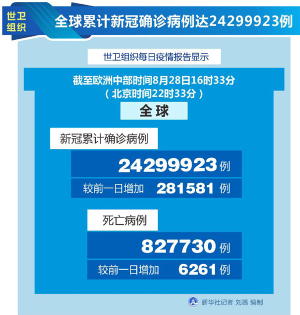 新華社日內瓦8月28日電(記者劉曲)世界衛生組織28日公布的最新數據顯示,全球新冠累計確診病例達24299923例。