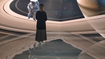 你可以置身蒼茫大漠中的火箭發(fā)射基地,感受火箭從腳下的大屏幕震撼升空;你可以穿過(guò)空間隧道,遨游眼睛形狀的宇宙星河,和宇航員來(lái)個(gè)親切擁抱;你還可以站在海面上,看巨大的鯨魚(yú)騰空躍出水面……