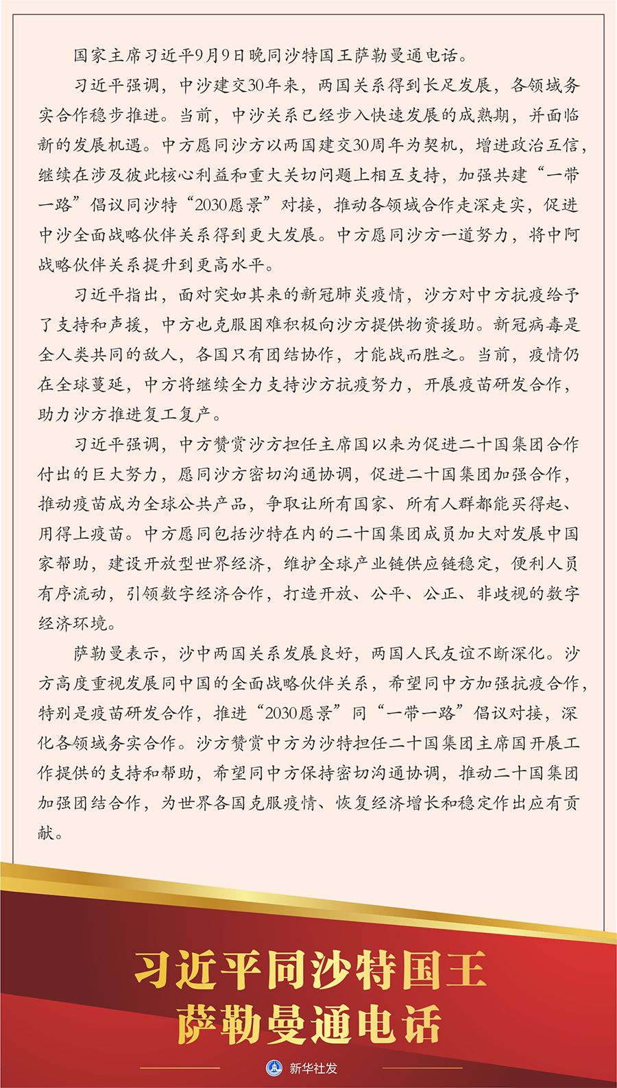 習近平指出,面對突如其來的新冠肺炎疫情,沙方對中方抗疫給予了支持和聲援,中方也克服困難積極向沙方提供物資援助。新冠病毒是全人類共同的敵人,各國只有團結協作,才能戰而勝之。當前,疫情仍在全球蔓延,中方將繼續全力支持沙方抗疫努力,開展疫苗研發合作,助力沙方推進復工復產。