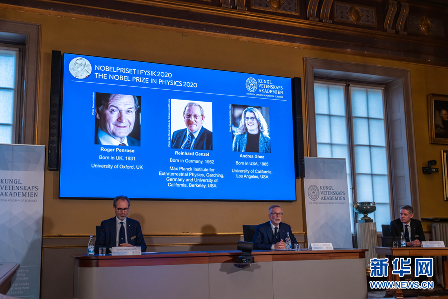 10月6日,在瑞典斯德哥爾摩,瑞典皇家科學(xué)院公布2020年諾貝爾物理學(xué)獎(jiǎng)獲得者。 新華社發(fā)(魏學(xué)超攝)