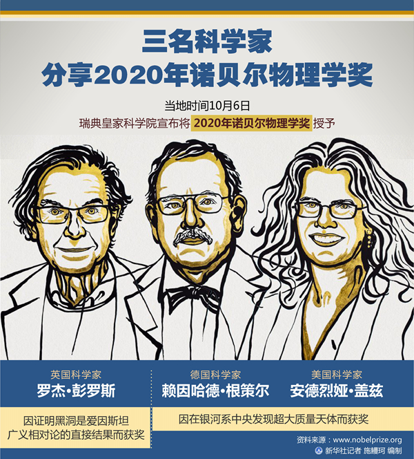 新華社斯德哥爾摩10月6日電(記者和苗 付一鳴)瑞典皇家科學(xué)院6日宣布,將2020年諾貝爾物理學(xué)獎(jiǎng)授予三名科學(xué)家。英國科學(xué)家羅杰·彭羅斯因證明黑洞是愛因斯坦廣義相對論的直接結(jié)果而獲獎(jiǎng);德國科學(xué)家賴因哈德·根策爾和美國科學(xué)家安德烈婭·蓋茲因在銀河系中央發(fā)現(xiàn)超大質(zhì)量天體而獲獎(jiǎng)。