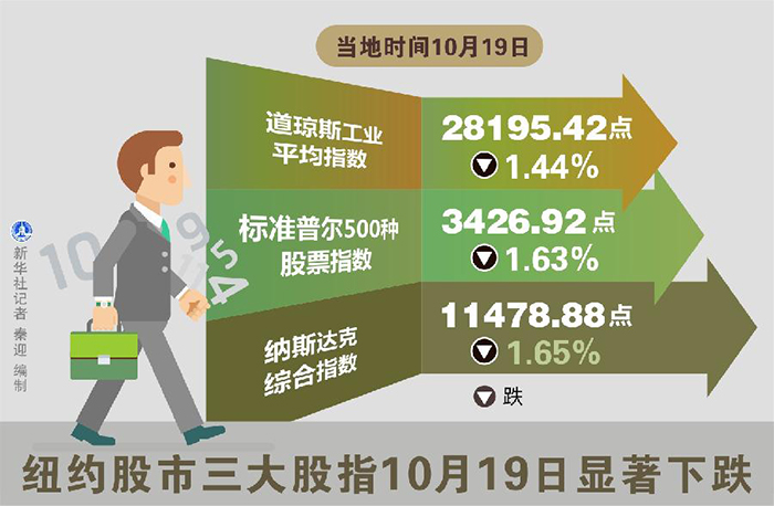 新華社快訊:紐約股市三大股指19日下跌,其中,道指跌1.44%,標普指數跌1.63%,納斯達克指數跌1.65%。