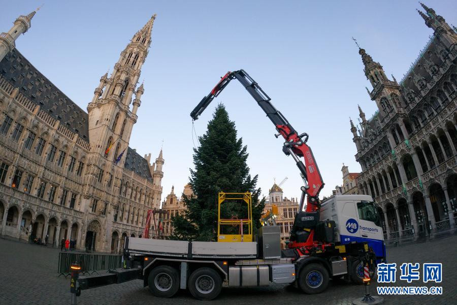 這是11月19日在比利時布魯塞爾大廣場拍攝的圣誕樹安裝現場。
