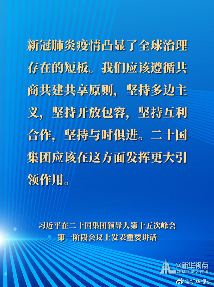 國家主席習近平21日晚在北京以視頻方式出席二十國集團領導人第十五次峰會第一階段會議并發表重要講話。以下是講話要點。