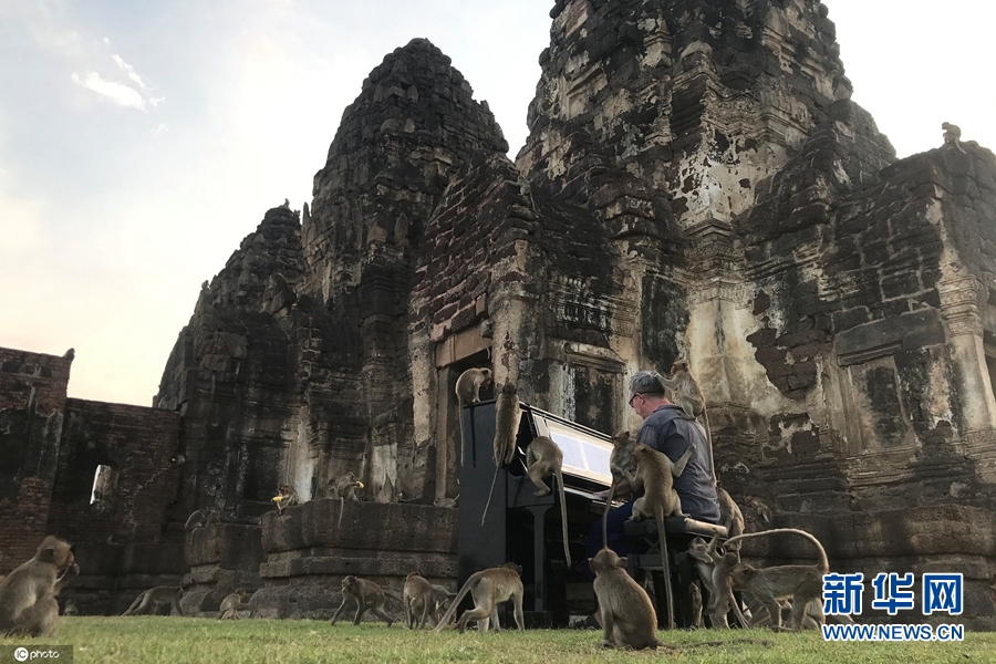 11月21日,泰國(guó)華富里府,英國(guó)鋼琴家保羅·巴頓(Paul Barton)為一群猴子彈鋼琴。演奏過(guò)程中,多只猴子在他周?chē)軄?lái)跑去,有幾只還爬上了鋼琴,甚至在他的頭頂跳來(lái)跳去。巴頓稱(chēng),這場(chǎng)特殊的音樂(lè)會(huì)旨在引起人們對(duì)這群饑餓的猴子的重視。(圖片來(lái)源:東方IC)
