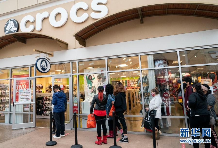 11月27日,人們?cè)诿绹?guó)馬里蘭州國(guó)家港灣一處購(gòu)物中心排隊(duì)等待進(jìn)店購(gòu)物。