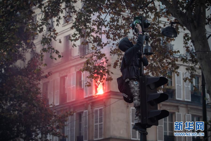 11月28日,一名男子在法國巴黎的游行示威中爬上桿子,向攝像頭噴漆。
