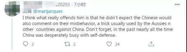 在這條推特下邊,許多網友為馬丁·雅克點贊。其中一位網友說道:“我認為真正讓他惱火的是,他沒想到中國人也會對他們的不當行為發表評論,這是澳大利亞人和其他國家對付中國的慣用伎倆。別忘了,在過去幾乎所有的時間里,中國都在拼命地進行自衛。”