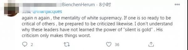 “又一次,白人至上的心態。如果一個人準備好批評別人,也要準備好同樣地被批評。我不明白為什么這些領導人沒有學會‘沉默就是金子’的力量。他的批評只會讓事情變得更糟。”