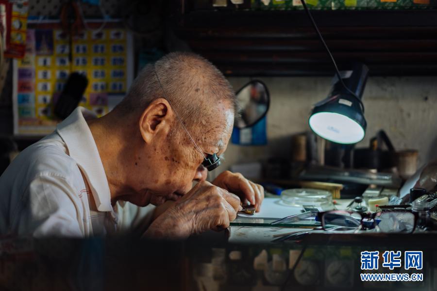 12月5日,在馬來(lái)西亞雪蘭莪州巴生的郁昌表行,韋華在維修手表。新華社記者 朱煒 攝