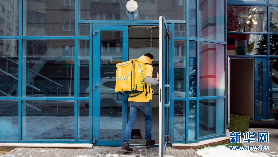12月10日,在哈薩克斯坦首都努爾蘇丹,一名外賣小哥走進一棟公寓樓為顧客送餐。新華社發(fā)(GLOVO公司供圖)