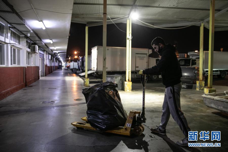 12月17日,在希臘比雷埃夫斯地區一處港口,一名工作人員收集剛從漁船上卸下的塑料垃圾。新華社發(萊夫特里斯·帕察里斯攝)