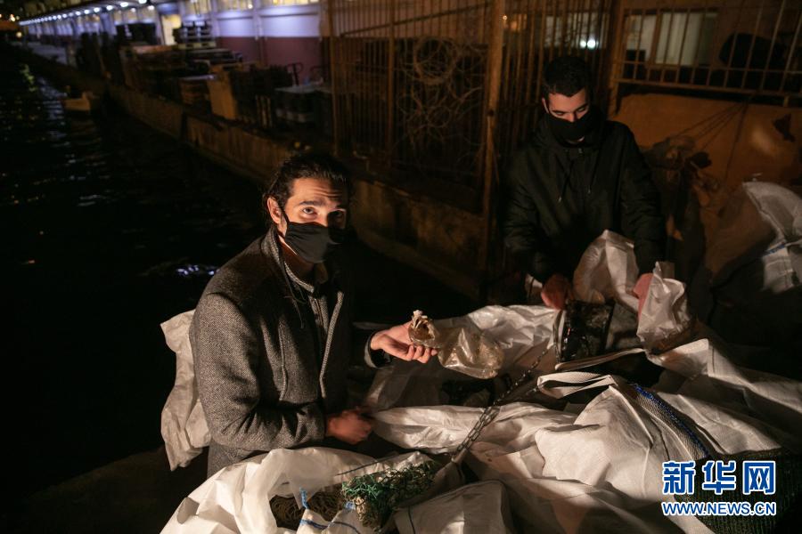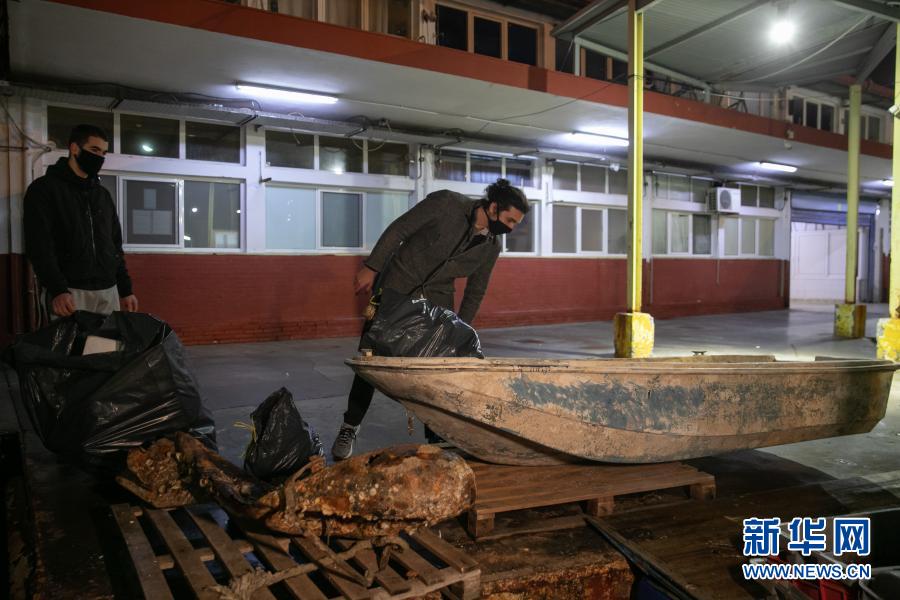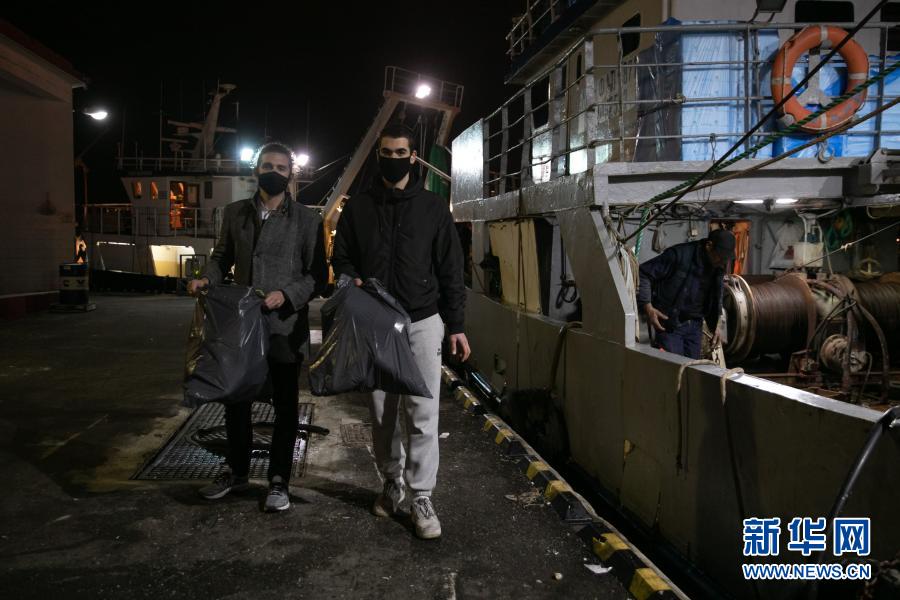 12月17日,在希臘比雷埃夫斯地區一處港口,阿拉帕基斯(左)與同事一同收集剛從漁船上卸下的塑料垃圾。新華社發(萊夫特里斯·帕察里斯攝)