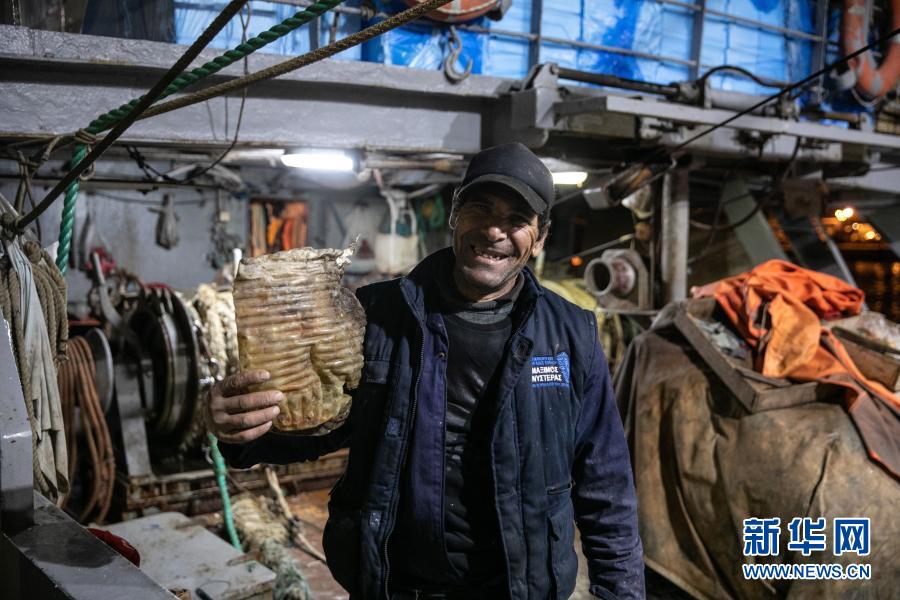 12月17日,在希臘比雷埃夫斯地區一處港口,一名漁民展示自己收集的塑料垃圾。新華社發(萊夫特里斯·帕察里斯攝)