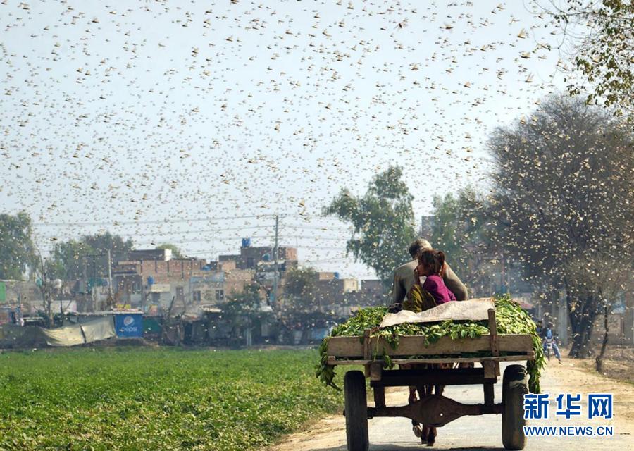 2月15日,在巴基斯坦東部旁遮普省的奧卡拉地區,漫天的蝗蟲肆虐(手機照片)。新華社發