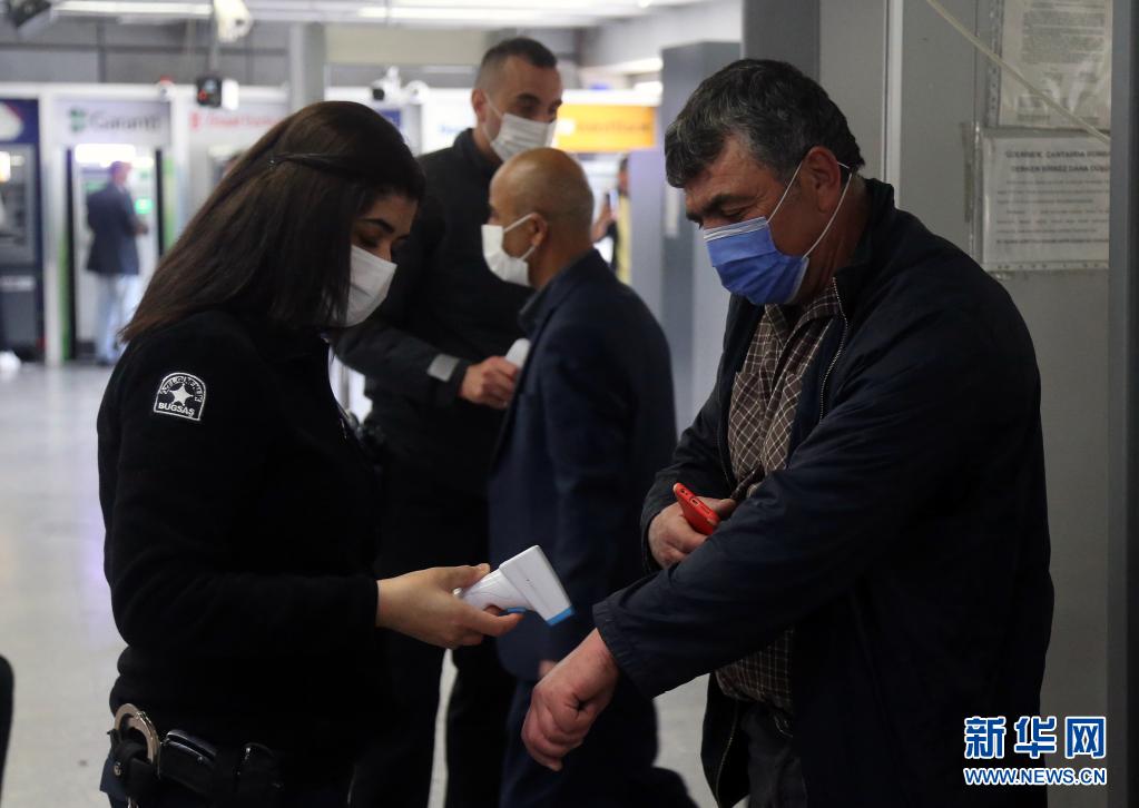 4月29日禁令實施前,一名安檢人員在土耳其安卡拉的公共汽車站給乘客測體溫。