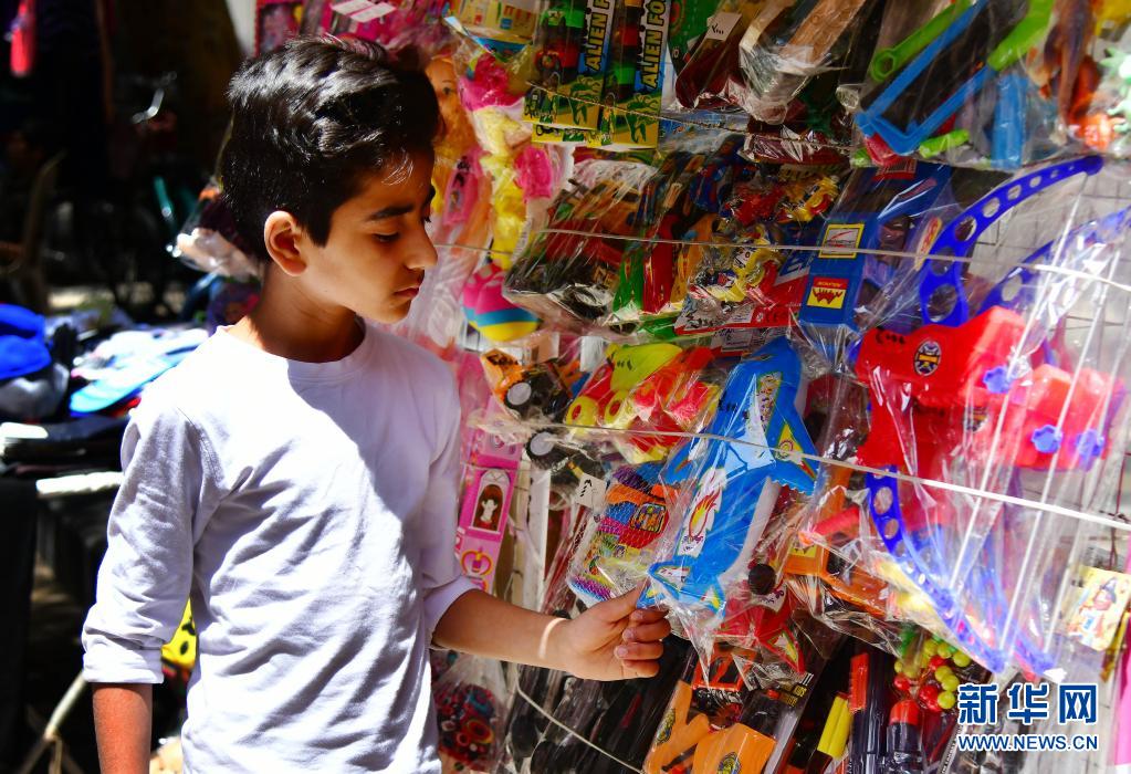 5月11日,一名兒童在敘利亞首都大馬士革的市場上挑選玩具。