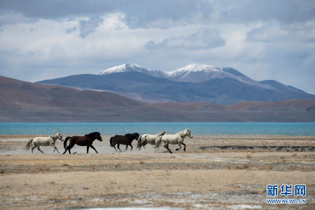 野馬在佩枯錯旁奔馳(5月14日攝)。