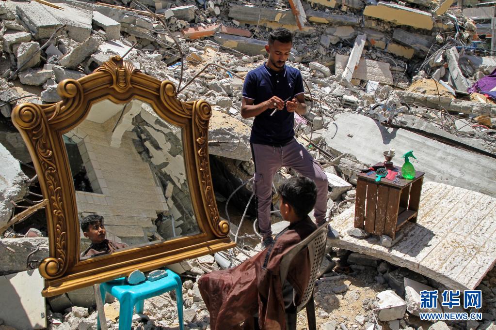5月26日,在加沙地帶北部的城鎮貝特拉希亞,23歲的巴勒斯坦理發師阿卜杜拉·扎瓦拉在他被以色列炸毀的房屋前為顧客免費服務。 新華社發(里澤克·阿卜杜勒·賈瓦德攝)