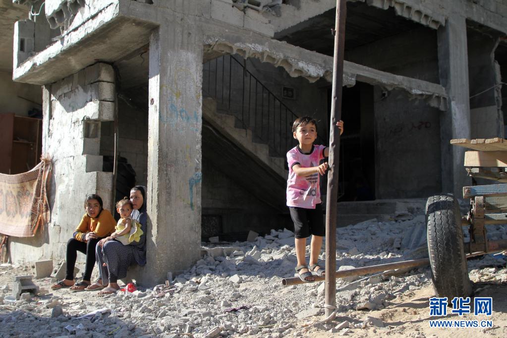 6月7日,在加沙地帶北部拜特哈嫩,巴勒斯坦人坐在遭以軍空襲損毀的建筑旁。