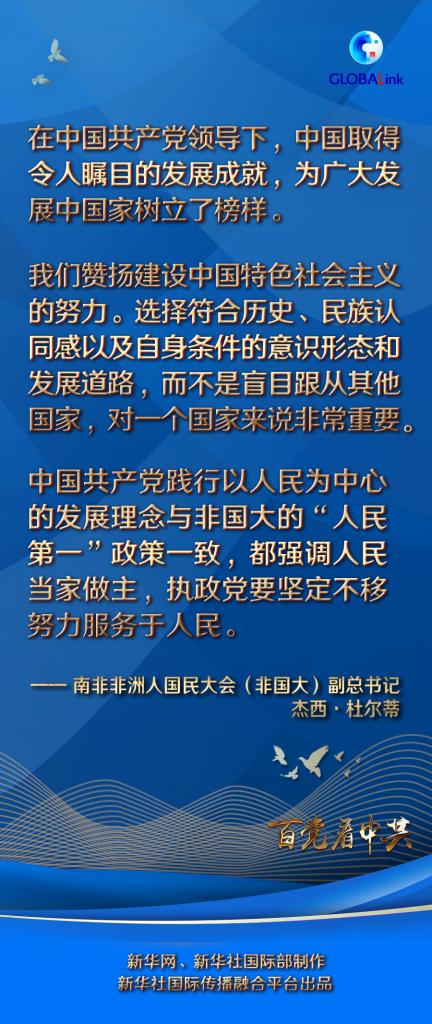 杜爾蒂說,2021年是中國共產黨成立一百周年,中國共產黨創造了一個又一個輝煌。“我謹代表非國大全國執行委員會祝賀中國共產黨走過成功的百年。預祝中國共產黨在下一個百年中取得更大成就!”