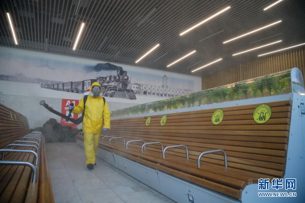 6月24日,工作人員身著防護服在俄羅斯莫斯科一個火車站進行消毒作業。